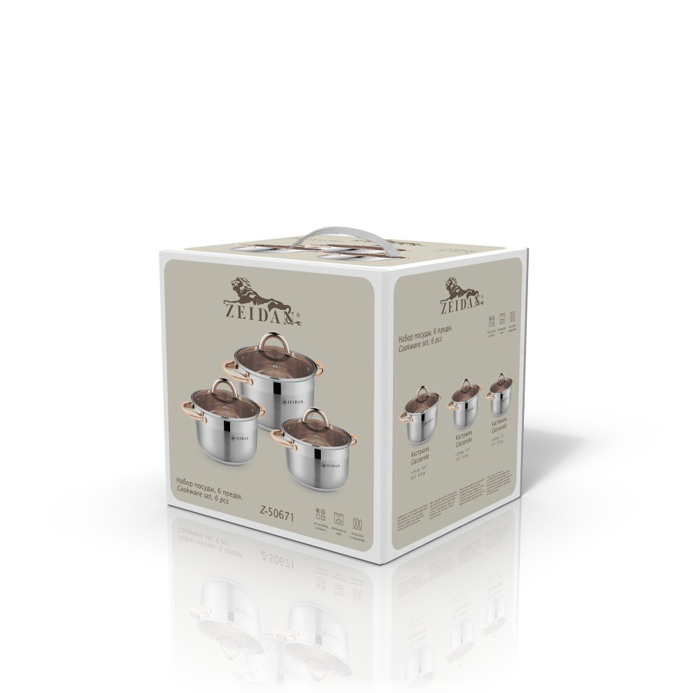 Набор посуды, 6 предм. (3 КАСТРЮЛИ С КРЫШКАМИ: 2.7 Л (d18 см ), 3.8 Л (d20 см ), 6.4 Л (d24 см ), нержавеющая сталь, 5-ти СТЕПОВОЕ КАПСУЛИРОВАННОЕ ДНО, цветная стеклянная крышка с ручкой «ПОД ЗОЛОТО», ручки на корпусе «ПОД ЗОЛОТО», внутренняя – зеркальная полировка корпуса, снаружи – комбинированная полировка корпуса.