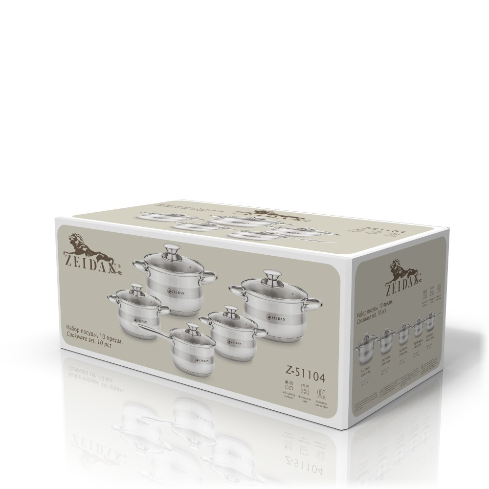 Набор посуды, 10 предм. (4 КАСТРЮЛИ С КРЫШКАМИ: 1.7 Л (d16 см), 2.5 Л (d18,0 см), 3.4 Л (d20 см ), 5.9 Л (d24 см ), СОТЕЙНИК С КРЫШКОЙ – 1,7 Л ( d16 см), нержавеющая сталь, комбинированная полировка снаружи, зеркальная полировка внутри, крышки - стекло, 5-ти СТЕПОВОЕ КАПСУЛИРОВАННОЕ ИНДУКЦИОННОЕ ДНО.