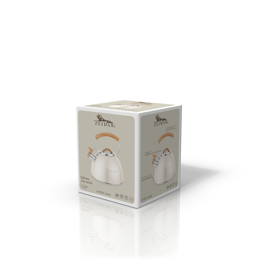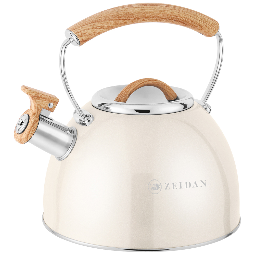 Чайник со свистком, 2,5 л, нержавеющая сталь, ИНДУКЦИОННОЕ ДНО, курковый механизм, внешнее покрытие – антипригарное цветное покрытие, устойчивое к высоким температурам, комбинированная фиксированная ручка с покрытием soft-touch «под дерево».