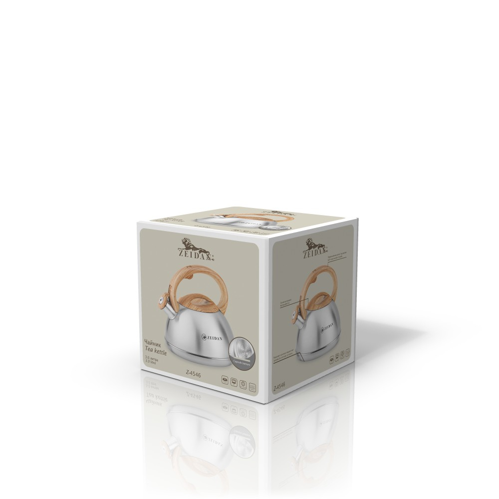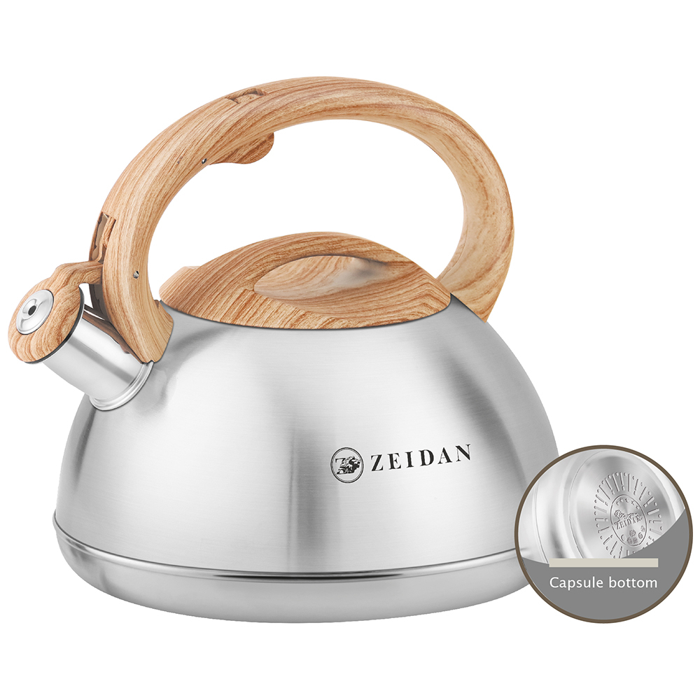 Чайник со свистком, 3,0 л, нержавеющая сталь, ИНДУКЦИОННОЕ КАПСУЛИРОВАННОЕ ДНО, курковый механизм, фиксированная ручка с покрытием soft-touch «под дерево».