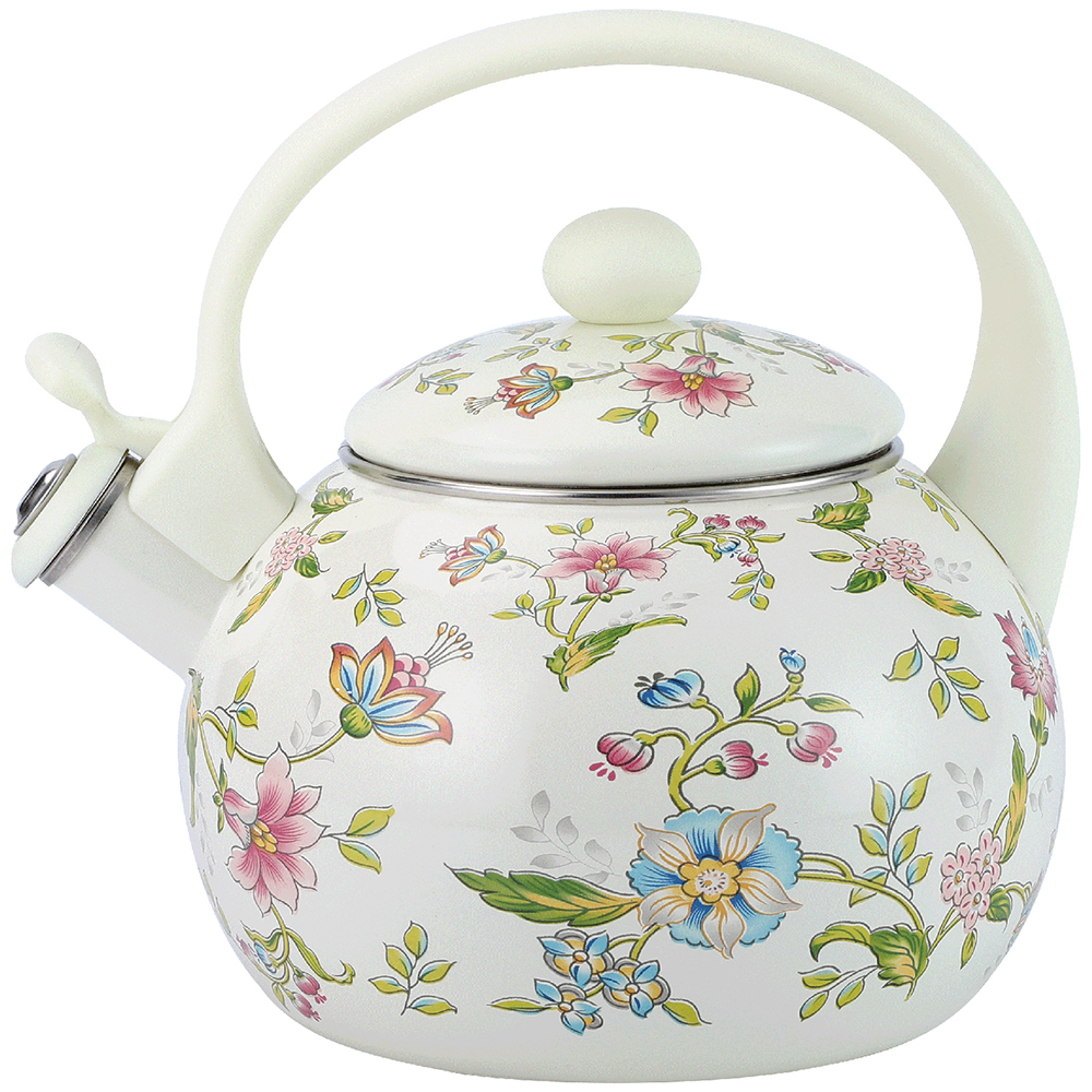 2,5 л, Чайник со свистком 2.5 л, эмалированная сталь, бакелитовая ручка, наружное покрытие - эмаль с рисунком. Подходит для индукции. Подарочная упаковка.